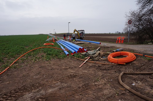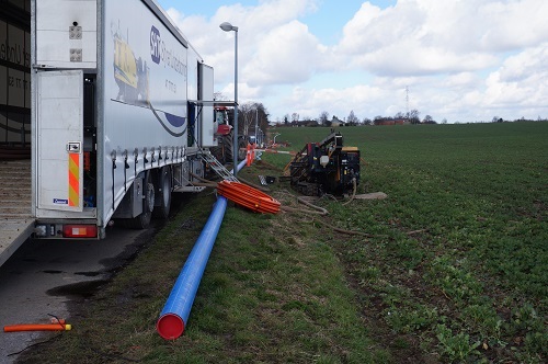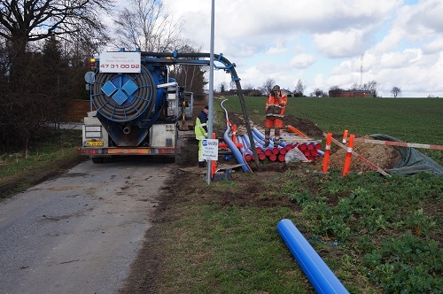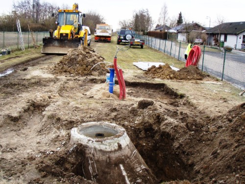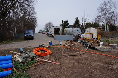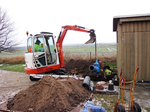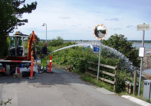 Ledningsrenovering, Søndervang, juni 2012. Den gamle eternitledning knuses, og den nye hovedledning trækkes igennem: