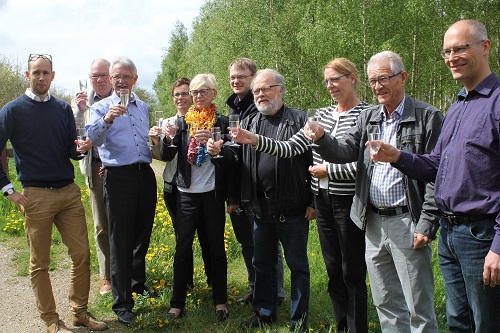 Repræsentanter fra de lokale vandværker og involverede myndigheder skåler i vand for at fejre aftale om skovrejsning: