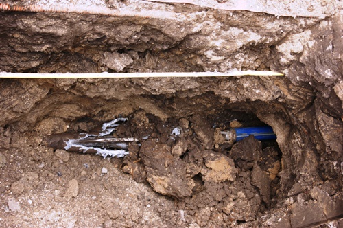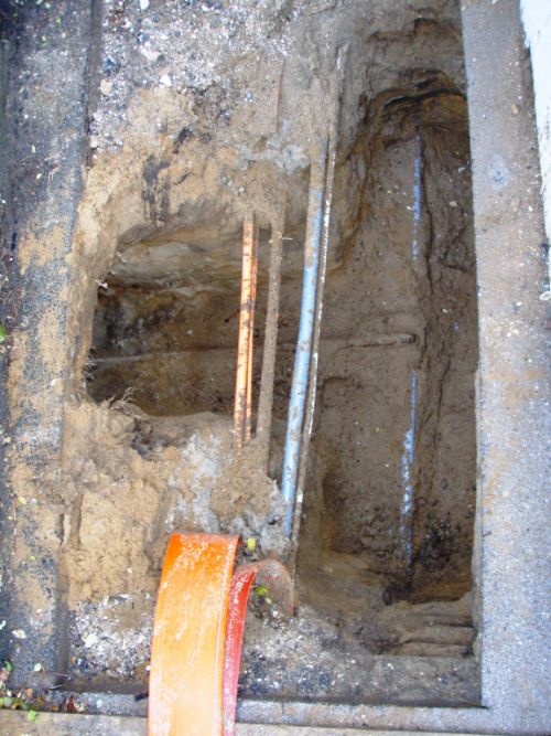 Ledningsrenovering, Skovbakken, november 2009. I bunden af hullet ses den gamle vandledning. Ovenover vandledningen ses diverse kabler (tele m.m), der omhyggeligt er gravet fri.