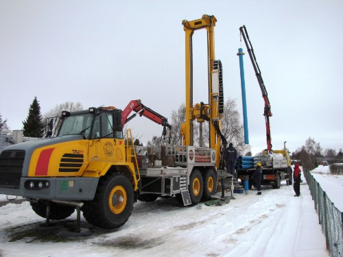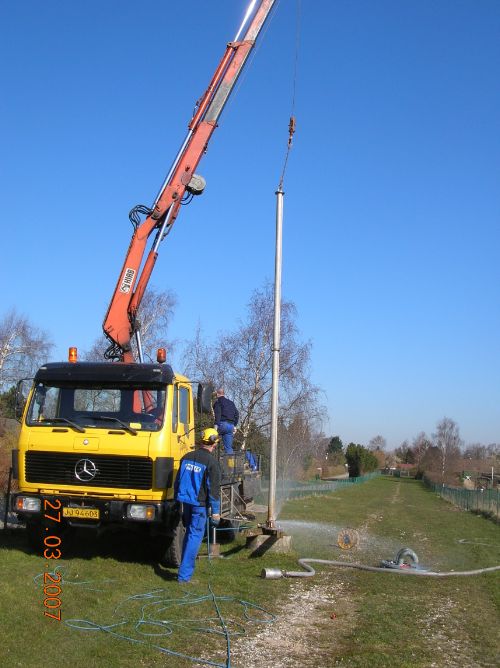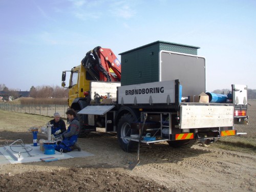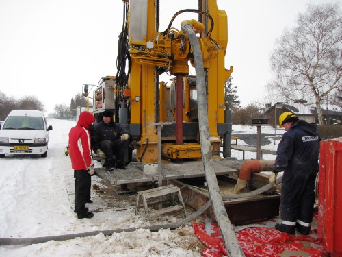 Vandværket, februar - maj 2010. Udførelse af erstatningsboring umiddelbart ved siden af boring 2. Den ny boring bliver ca. 85 m dyb og er en såkaldt "kalk-boring", idet den føres ned til kalken i undergrunden.